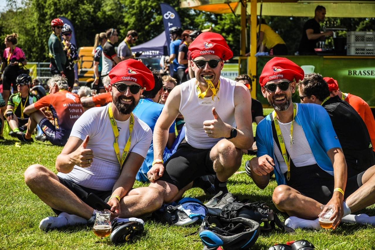 Oef, na het voltooien van de toertocht ben je wel toe aan een ijskoude Chouffe. Maar niet voordat je een handige medaille met flessenopener en Chouffe Classic zonnebril hebt ontvangen. Eerst de fiets stallen in de fietsenstalling en dan is het moment om te relaxen echt gekomen. Fietsbril af, zonnebril op! De goedgemutste deelnemers genoten nog lang in de namiddagzon van de diverse spellen en de heerlijke bieren van Chouffe. Met een gezellige DJ en voldoende bier was het nog lang gezellig bij Chalet Chouffe.
